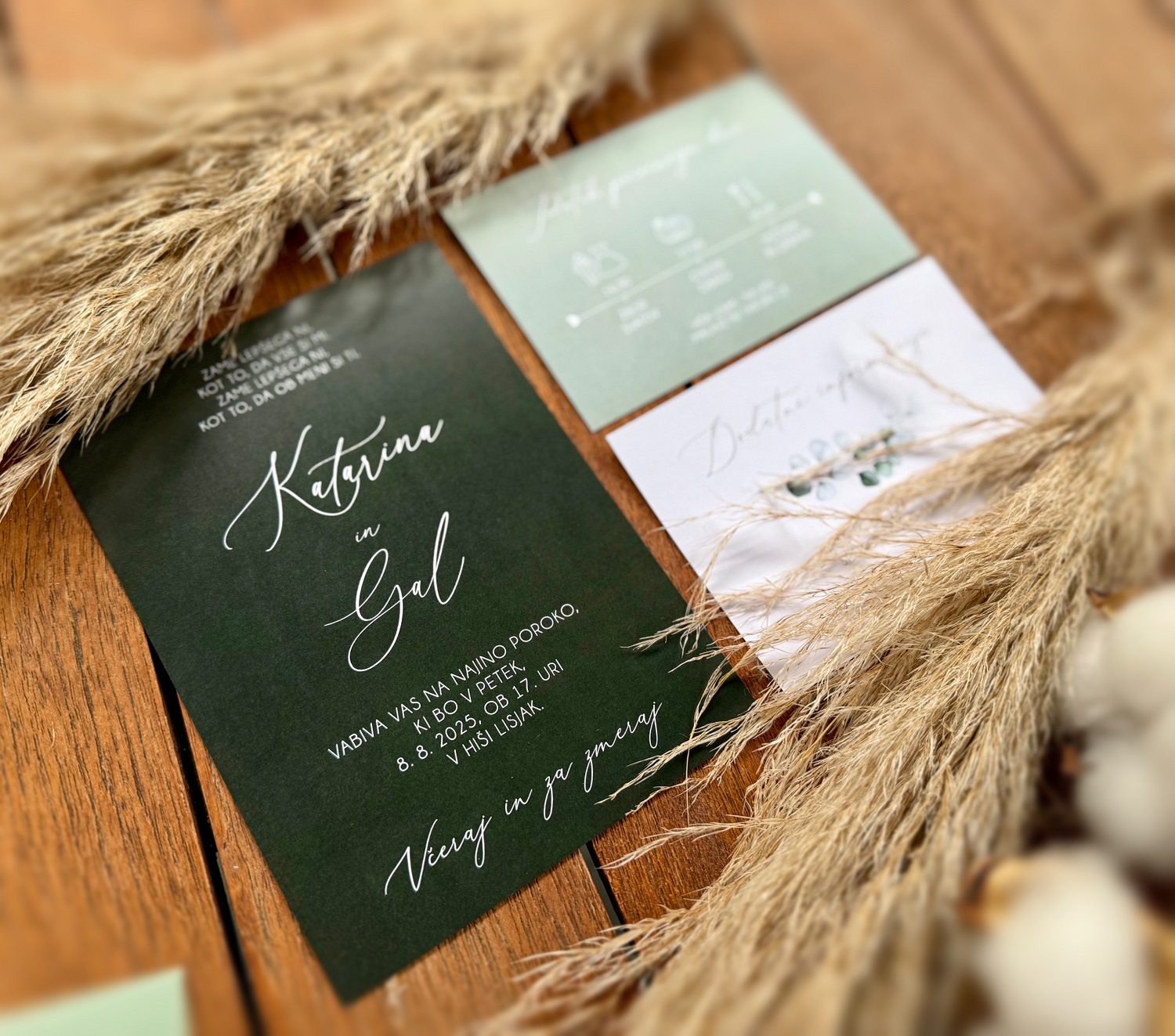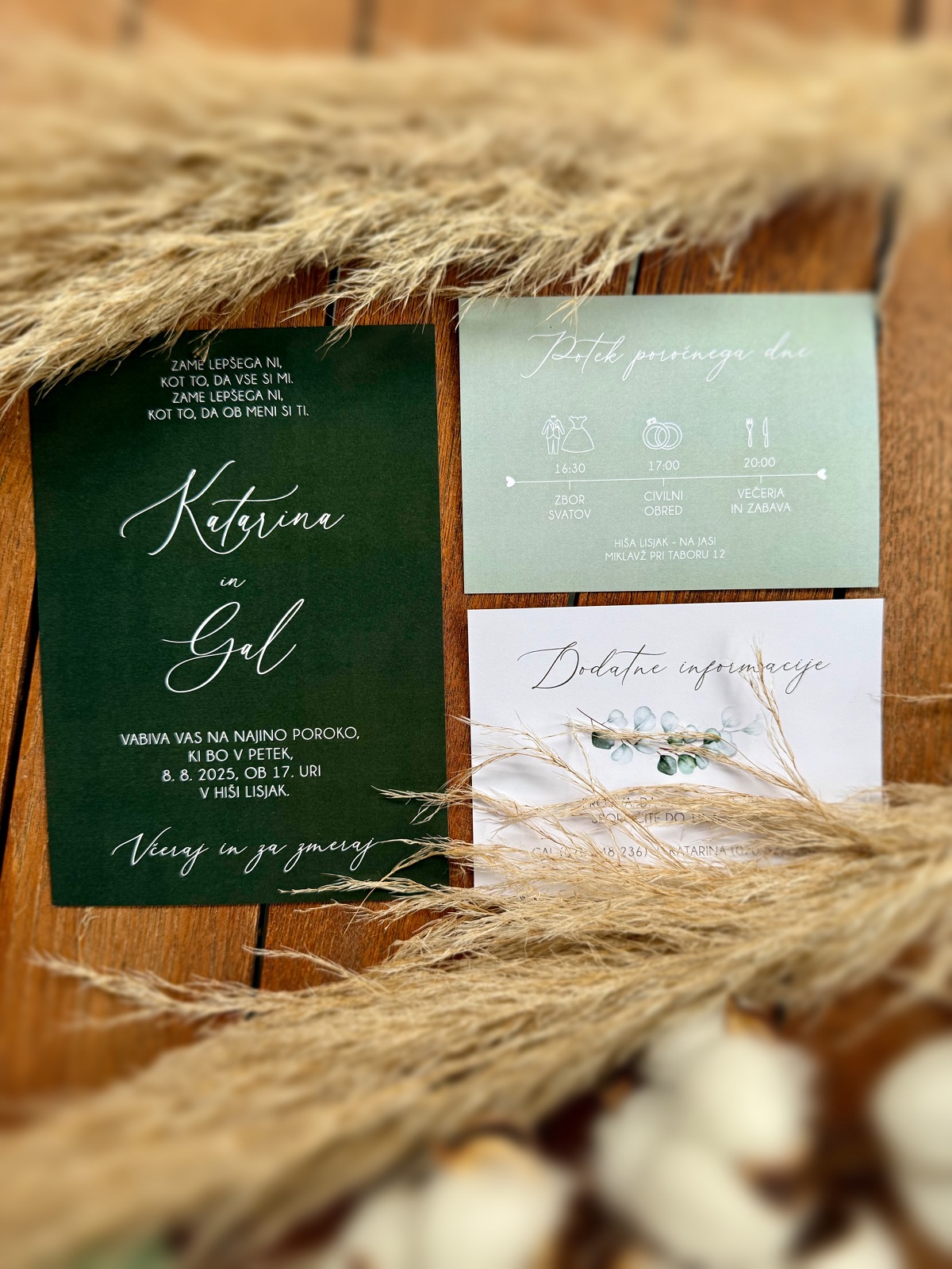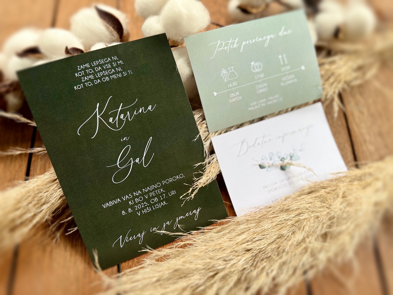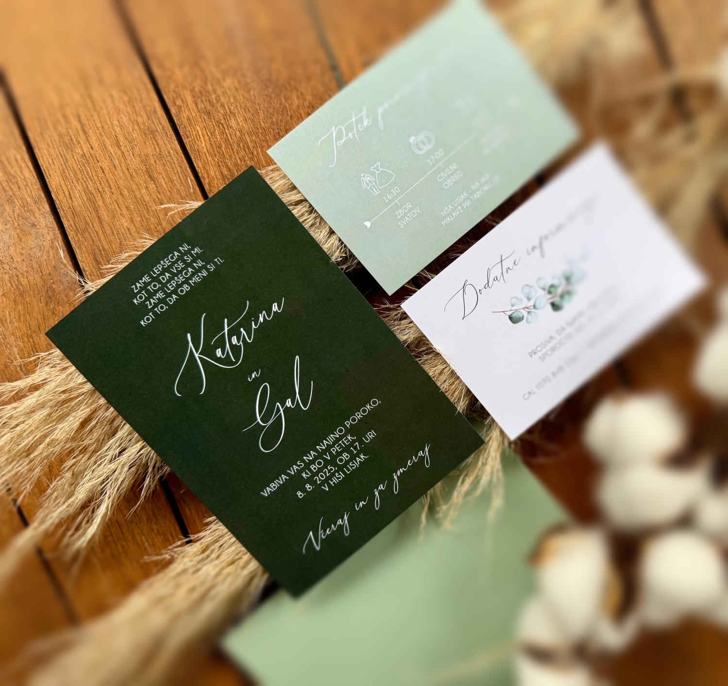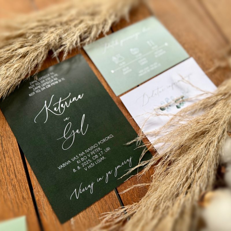 Na voljo vam je v katerikoli barvni kombinaciji. Spremenim mu lahko tudi pisavo, postavitev teksta, barvo in ostalo. Cena že vsebuje oblikovanje po vaših željah, obojestranski tisk, izdelavo in kuverte v želeni barvi. Poročne tiskovine lahko sicer naročite preko spletne trgovine. Še raje pa vidim, da mi vaše želje glede izgleda in vsebine, zaupate preko elektronske pošte finimini.dizajni@gmail.com ali s klicem na 041 975 968. Tako jih bomo lahko prilagodili vajinemu okusu in uskladili z videzom lokacije ter cvetlične dekoracije.