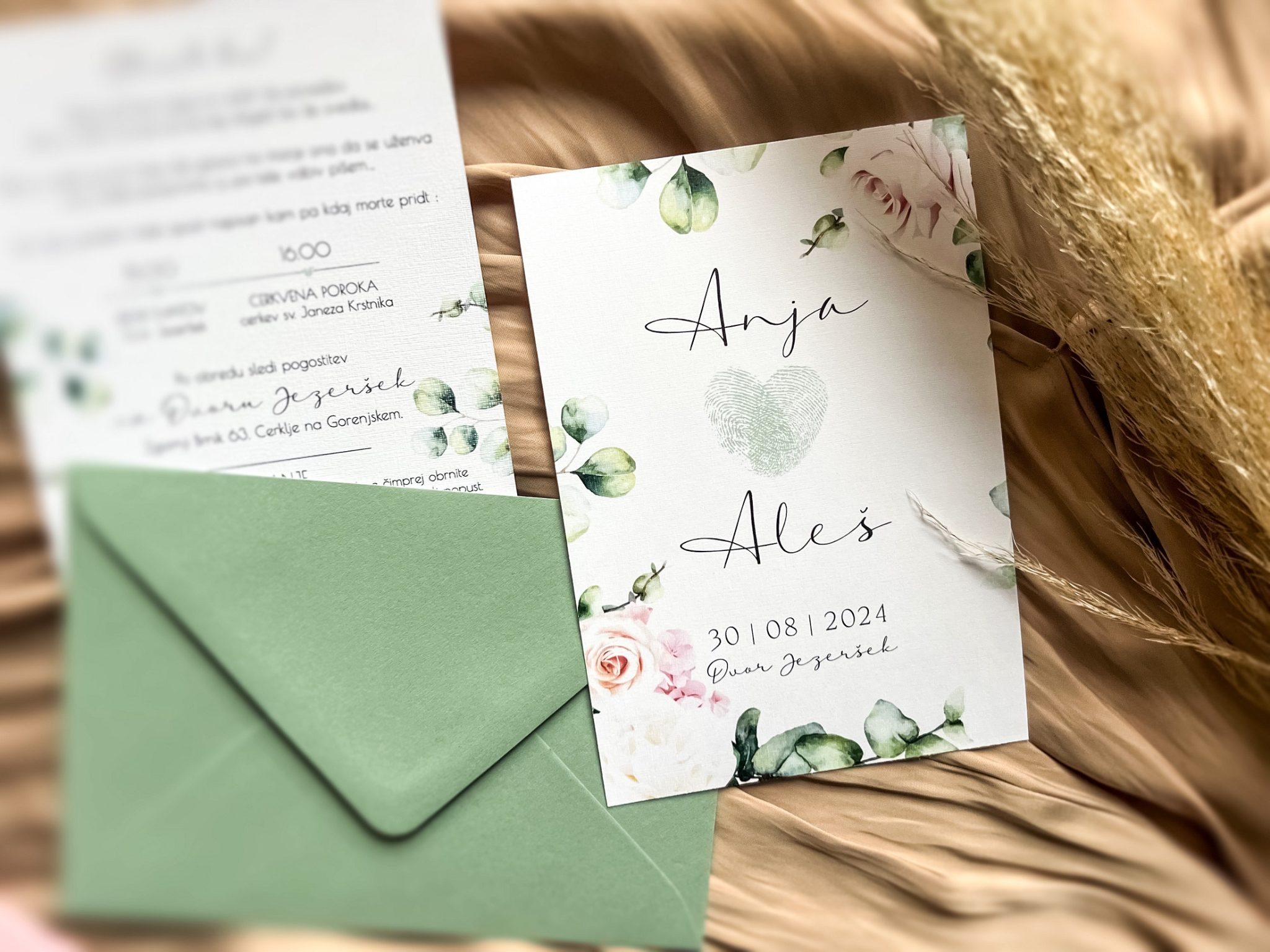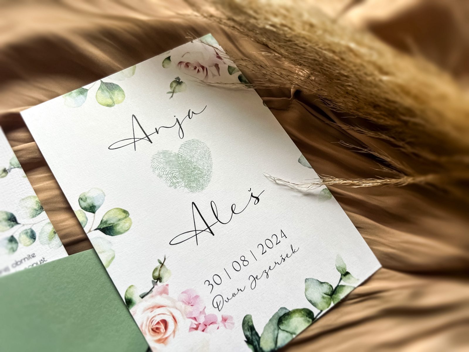 Na voljo vam je v katerikoli barvni kombinaciji. Spremenim mu lahko tudi pisavo, postavitev teksta, barvo in ostalo. Cena že vsebuje oblikovanje po vaših željah, tisk, izdelavo in kuverte v želeni barvi. Poročne tiskovine lahko sicer naročite preko spletne trgovine. Še raje pa vidim, da mi vaše želje glede izgleda in vsebine, zaupate preko elektronske pošte finimini.dizajni@gmail.com ali s klicem na 041 975 968. Tako jih bomo lahko prilagodili vajinemu okusu in uskladili z videzom lokacije ter cvetlične dekoracije. IZBERETE LAHKO: Vabilo predstavljeno na spletni strani Spremenimo mu lahko prav vse – uporabljen vzorec, obliko, pisavo, barve, postavitev in papir. Kombinacijo vabil Verjetno vam je pri enem vabilu všeč pisava, pri drugem vzorec in pri tretjem oblika. Sporočite mi vaše želje in bodite brez skrbi, saj so prilagoditve brezplačne. Vabilo po vaši idejni zasnovi Vabila oblikujem tudi po meri. Pošljite mi opis vaših želja in morebitne skice. PO ODDAJI NAROČILA Boste v roku treh dni, prejeli nekaj različnih predlogov izgleda vabila. Nato se mi boste oglasili z vašimi morebitnimi popravki ali dodatnimi željami. Popravke bomo delali, dokler vama vabilo ne bo povsem všeč. Po vajini potrditvi, bo šlo vabilo v tisk in ga lahko pričakujeta v 4-8 dneh. Odvisno od kompleksnosti vabila. Tiskovine običajno pošiljam po pošti, možen pa je tudi oseben prevzem na Vrhniki ali okolici. USKLAJENOST VABIL Z OSTALIMI POROČNIMI TISKOVINAMI Ostale poročne tiskovine, ki jih potrebujeta in želita na vajin poročni dan, bomo uskladili z videzom vabila. Za prav vsako vabilo, vama lahko izdelam stilsko usklajene menijske in imenske kartice, sedežni red, oznake miz, zahvale, nalepke za vino in darilca, kartončke, brošure in različne napise. CENA VABIL Na spletni strani so vsem vabilom pripisane cene. Veljajo za najbolj pogosto naročeno količino vabil, to je okrog 30 kosov. Prav vse cene že vsebujejo oblikovanje, prilagoditve in spremembe, tisk, papir in tudi kuverte. Torej, vse. Barvo kuvert določimo skupaj, glede na videz vabila. Pečat se doplača 0,80 €.