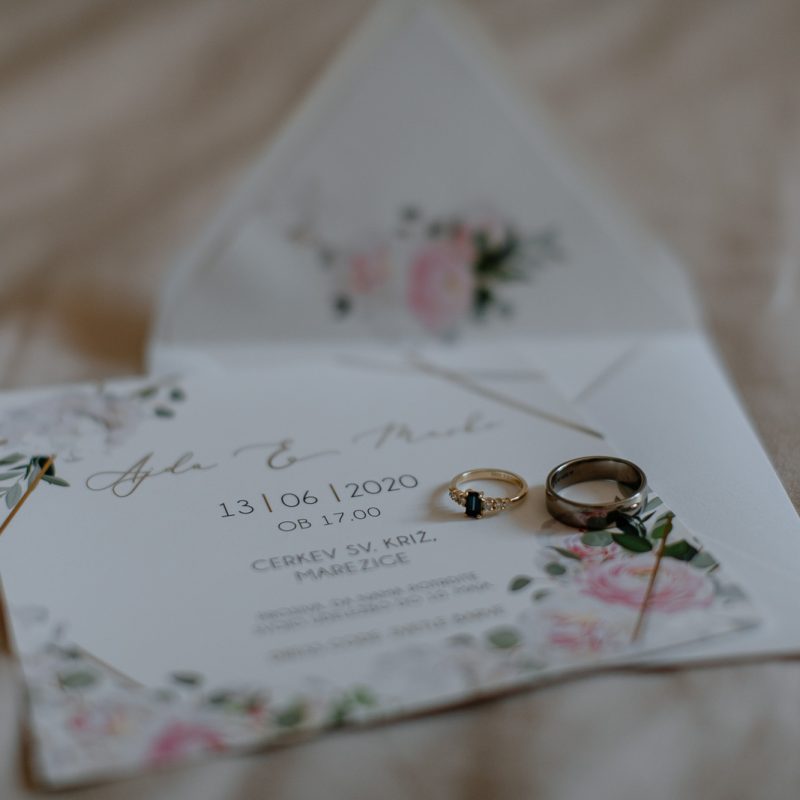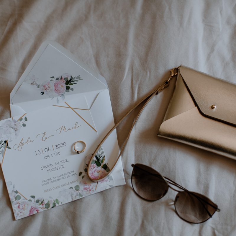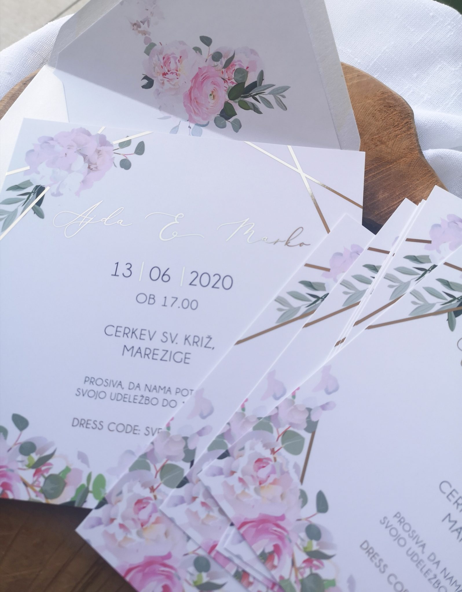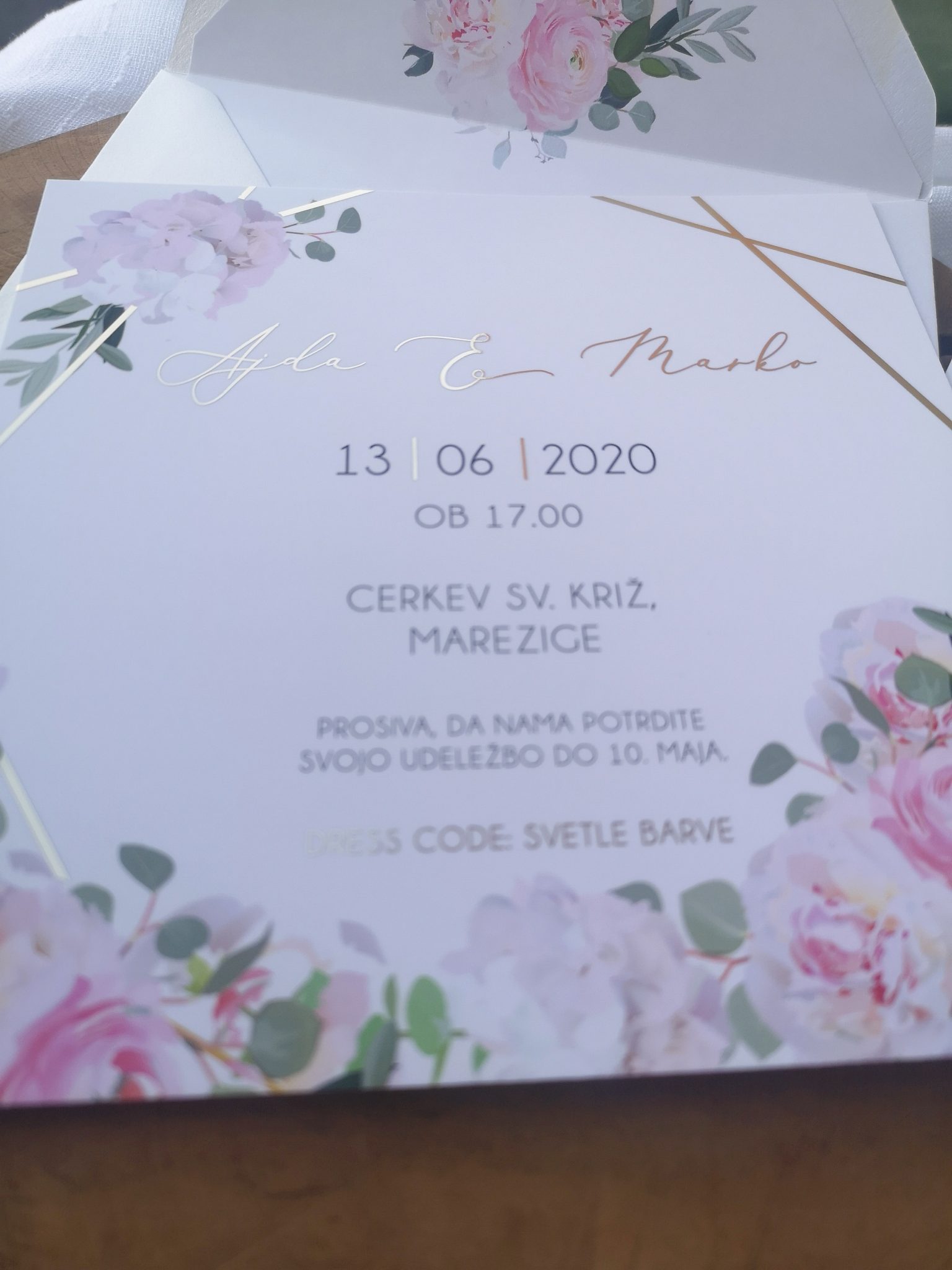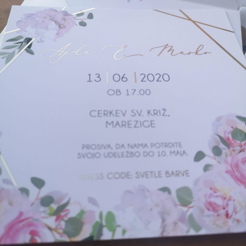 Na voljo vam je v katerikoli barvni kombinaciji. Spremenim mu lahko tudi pisavo, postavitev teksta, barvo in ostalo. Cena že vsebuje oblikovanje po vaših željah, tisk, izdelavo in kuverte v želeni barvi. Uporabljen je zlatotisk (zlata se sveti).